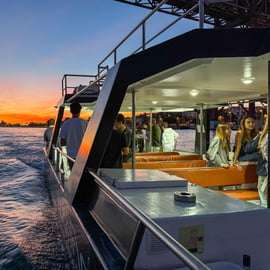 Naviguez tranquillement le long du Tage à bord d'un catamaran confortable, tandis que la ville se transforme dans la lumière du crépuscule.