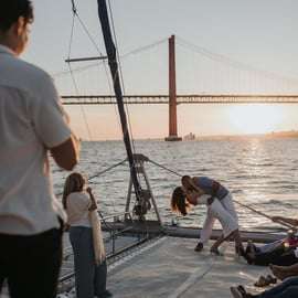 Embarquez pour une inoubliable croisière au coucher du soleil, à bord d'un élégant catamaran voguant sur le Tage. Imaginez-vous, un verre à la main, bercé par le doux balancement du bateau, confortablement installé sur ses filets. Laissez-vous envoûter par la beauté des monuments emblématiques de Lisbonne qui défilent sous vos yeux : l'imposante Tour de Belém et l'élégant Pont du 25 Avril, illuminés par les derniers rayons du soleil. Un moment de pur enchantement vous attend !