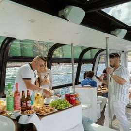 Ne vous inquiétez pas si la météo semble peu clémente : notre bateau peut être entièrement vitré, assurant un maximum de confort pour que la fête se poursuive, qu'il pleuve ou qu'il vente.