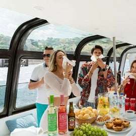 Profitez d'une croisière à la fois vibrante et élégante à bord de notre bateau luxueux et extrêmement confortable, conçu pour la détente, les moments sociaux et les vues inoubliables. Cette expérience haut de gamme comprend un open bar avec vinho verde Casal Garcia blanc et rosé à volonté, sangria blanche, porto tonic, bière portugaise, boissons sans alcool, eau minérale et café, ainsi qu'un buffet de dégustation portugais comprenant du pão de queijo, des cacahuètes grillées, du raisin frais et l'emblématique pastel de nata, le tout dans une atmosphère animée et accueillante à bord.