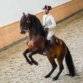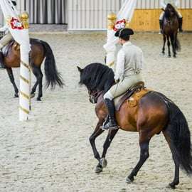 Passez une matinée avec des chevaux lusitaniens et assistez aux exercices d'échauffement et de débrouillardise effectués par les cavaliers en costume d'époque.