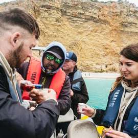 Choisissez votre point de départ : directement au port de Sesimbra, ou optez pour un transport confortable depuis un point de rendez-vous central à Lisbonne (aller-retour inclus). À bord d'un bateau semi-rigide, vous sillonnerez les eaux paisibles de l'océan, protégées des vents par la majestueuse montagne d'Arrábida.