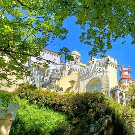 Palais et parc de Pena, admirez le palais de Pena, l'une des attractions touristiques les plus magnifiques et les plus reconnaissables du Portugal. Le palais illustre le style architectural romantique du XIXe siècle et se dresse au sommet d'un pic rocheux, qui est le deuxième point le plus élevé des collines de Sintra. Il offre une vue panoramique sur les forêts paisibles et les jardins luxuriants couverts de plantes et de fleurs exotiques. Le palais de Pena a été classé monument national en 1910 et fait partie du paysage culturel de Sintra, classé au patrimoine mondial de l'UNESCO depuis 1995.