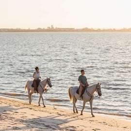 Sur le sable de la plage fluviale de Gaio Rosário, les chevaux se promènent au son des petites vagues de la rivière. L'odeur de l'air marin et le sable blanc parsemé de coquillages nous font prendre conscience que ce Tage est plein de vie. En groupe de 1 à 10 personnes, venez profiter de ce moment unique, à un rythme tranquille que vous n'oublierez jamais.