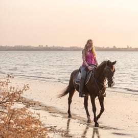 Balade à cheval en groupe sur la plage au coucher du soleil. En groupe de 1 à 10 personnes, venez profiter de ce moment de paix et d'harmonie, et créez des souvenirs inoubliables.